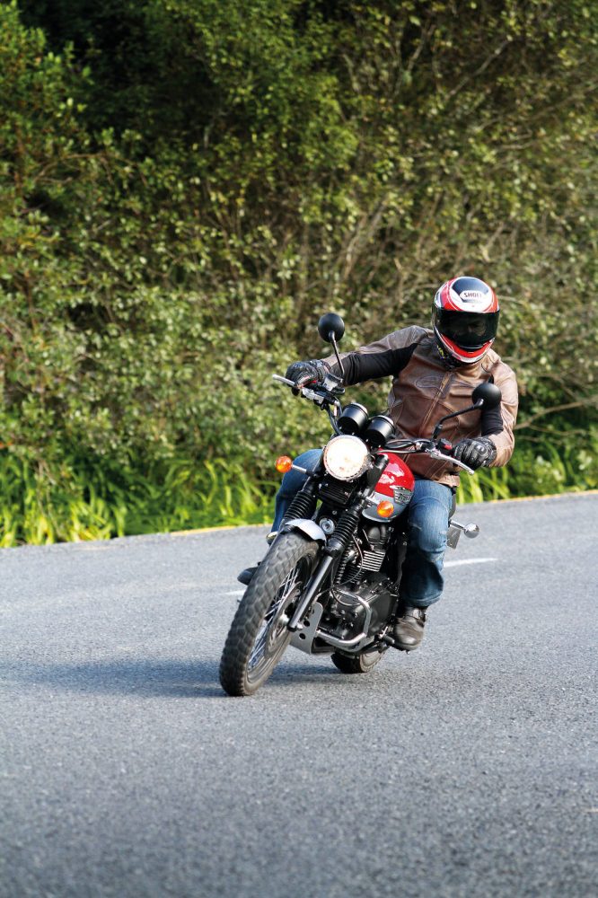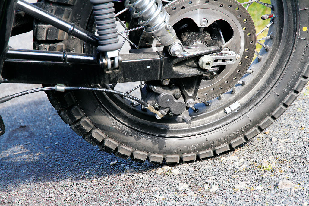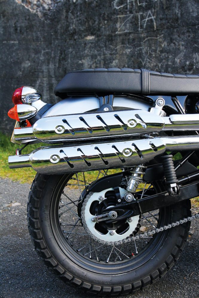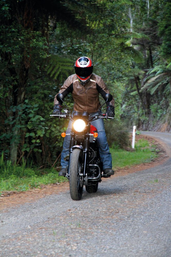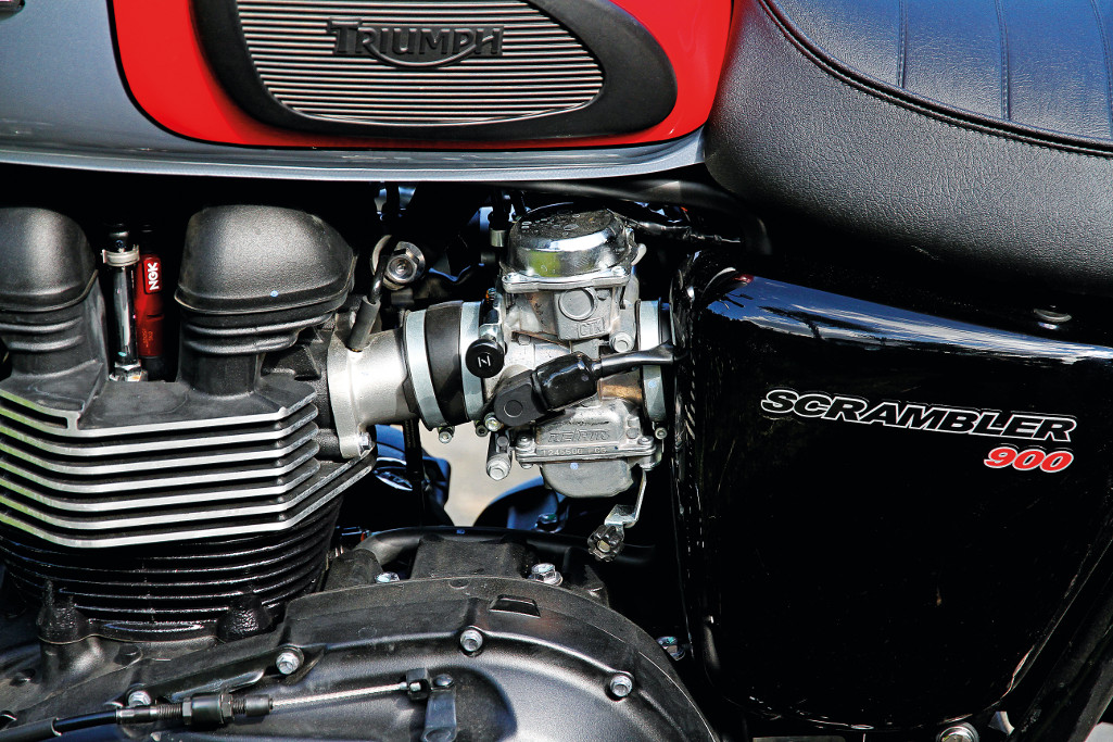The exhaust has to have been designed by a rider who habitually puts his or her left boot down, as the exhaust does deflect your straightened right thigh a bit at the lights. Fortunately, the shrouding heat shields avoided the sharp burning associated with the up-pipes of the ‘good old days’ and once rolling, all was fine. On the downside, it does get in the way if you give it the ‘scramble’ message on gravel. You need to cock one leg out when you’re up on the pegs and you can’t grip the flanks of the bike effectively, or evenly with your inner calf zone, when sliding, so serious gravel play isn’t going to win the pipe any friends. Also, the underslung rear brake calliper and exposed brake line whispers adventure rather than openly stating any such intentions. It’s the price you pay for the look. But, really, that’s a pretty good trade. Adding to the vintage scrambler theme is a classy little front guard, cut in the classic form of the Sixties hot-rod style and the cool mock carbies, complete with ‘choke’ lever. It is used as a fast idle switch to help the slightly cold-blooded nature of any air-cooled engine first thing in the morning..