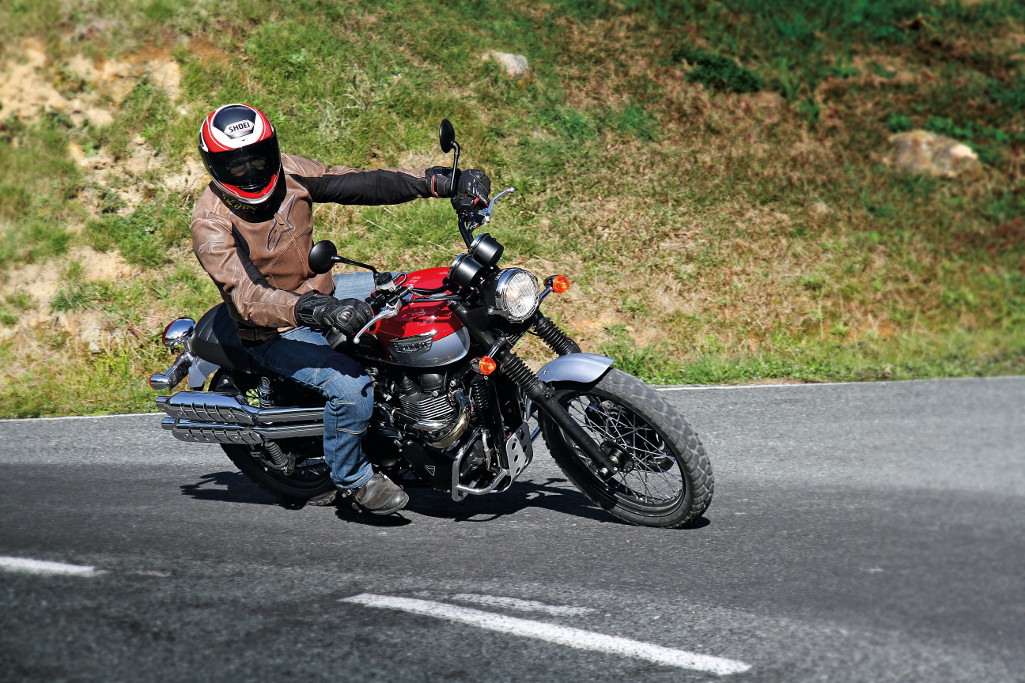 With the spoked wheels and trendy soft-road tread pattern, it’s a great looking motorcycle, even if it isn’t your thing. The blending of T100 parts makes sense; and although it looks quite different, that’s where all the base components bar the crankshaft, footpegs and handlebars come from. From there, it’s all about styling. Looking back through the mists of time, that’s exactly what the original scramblers were. The collectable Triumph Trophy series were used in scrambles, trials and road events. With the modifications back then being upswept exhausts, short alloy guards and wide ‘bars, the new Scrambler is looking more authentic all the time. With the sport of scrambling being natural terrain and jumps considered mere bumps by modern dirt bikes, the quintessential description of the original ‘Scrambler’ is reflected surprisingly accurately by the Triumph. The old legends would have raced it in paddocks. Now, we have more suitable options, so the modern Scramblers, from all the brands, are hardly likely to get airborne when off-road. It’s nice to feel like you could, though… for back road exploring, complete with gravel, the low C-of-G and mild and nicely metered power makes the Scrambler happily burble anywhere you ask. On the seal, it’s a satisfying and relaxed ride, as you’d expect with the modest power figures rendering the total absence of electronic intervention quite in keeping. With the single disc, ABS is not hugely missed, but it’ll no doubt be added next year. If you struggle with the lack traction control on the solidly built and mild-mannered Triumph Scrambler, you’re doing it wrong… tyre shredding is not what this cool retro is about. But, then, it’ll still top the ‘ton’.
