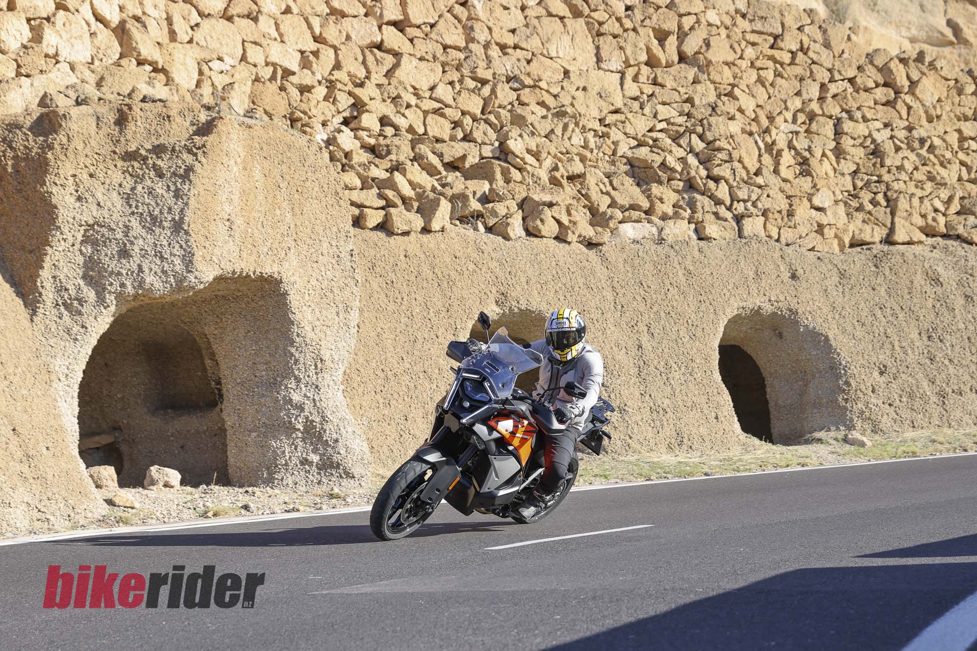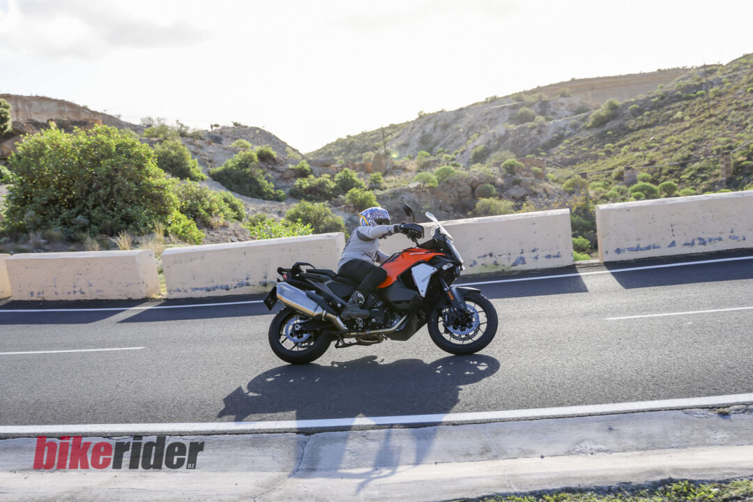 It’s not quite as agile as a Ducati Multistrada V4 S or BMW R1300 GS on road tyres, though. Both are astonishingly nimble for their class, and while the KTM is lighter than the Ducati, it turns a little slower, particularly with the 23-litre tank brimmed.