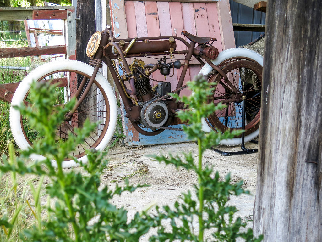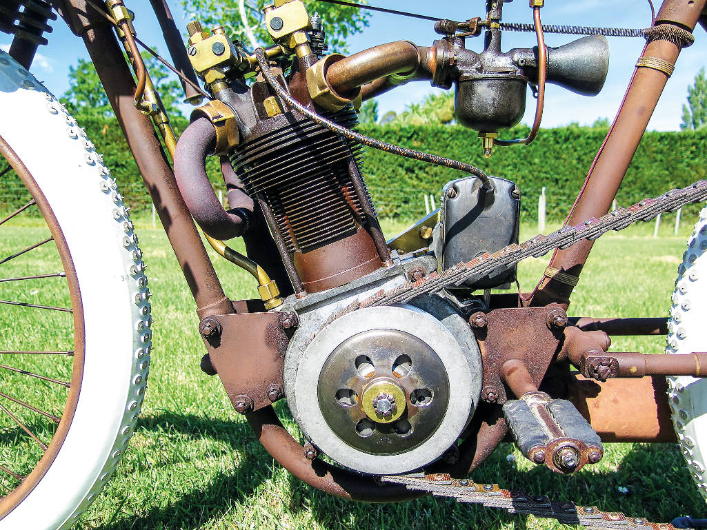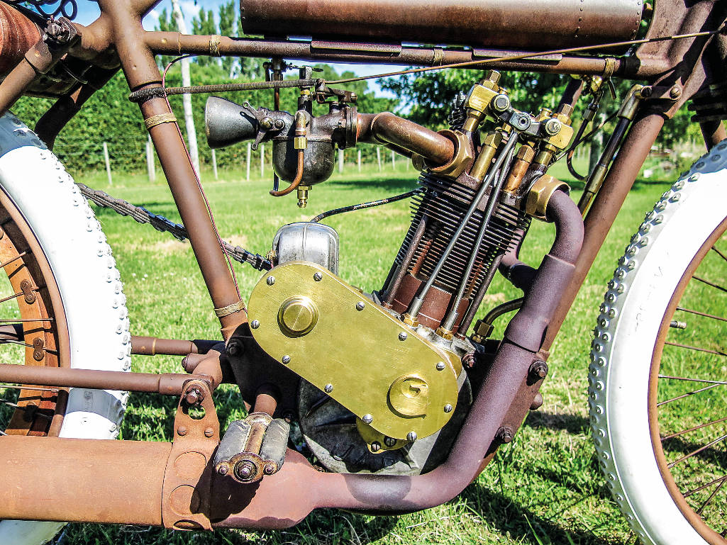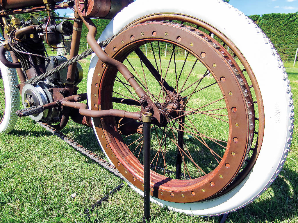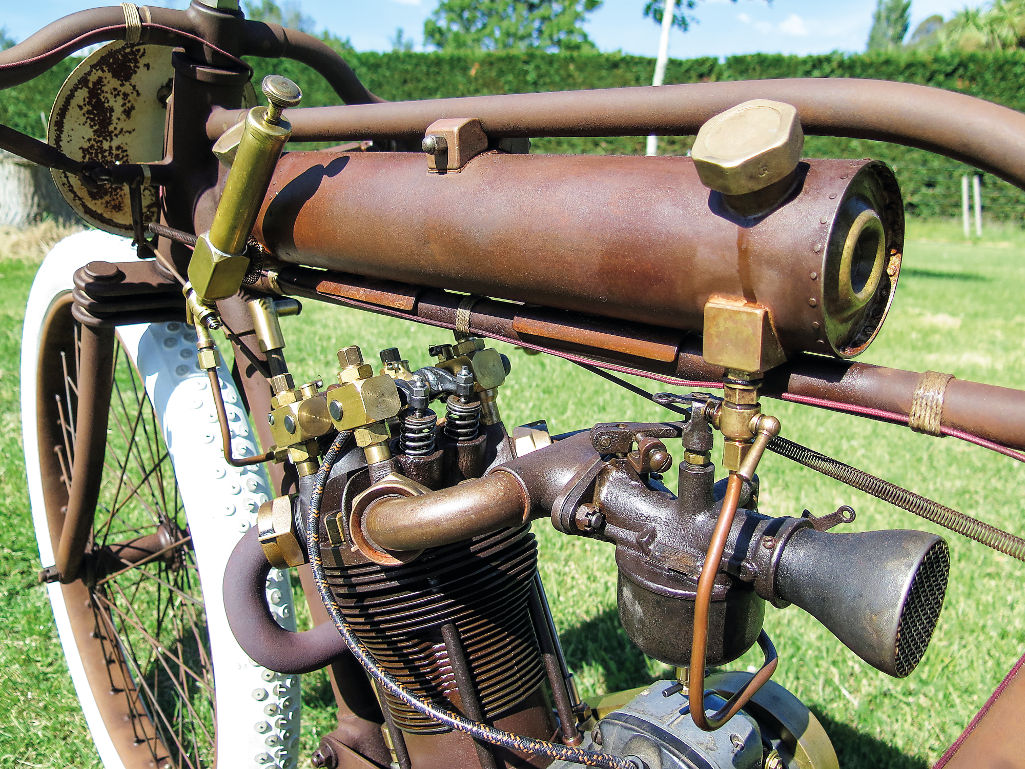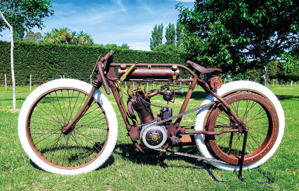 Chris has deliberately chosen that his bike look like a barn find that has languished for 100 years, so the only paint is on parts that cannot be seen, and the rest of the metallic parts have been chemically treated using diluted swimming-pool chlorine to encourage the rusty finish. The bike was then washed and oiled to prevent further rusting. The weekend after the bike was finished, it was entered in the annual Smash Palace-sponsored bike show in Christchurch, where it won the People’s Choice’ award, and rightly so, in my opinion.