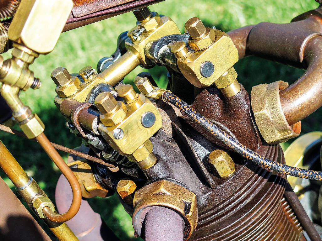 The starting procedure is to open the exhaust valve lifter on the left hand twist grip, allowing the engine to turn as fast as the mixer can before engaging full compression and adjusting the conventional throttle with the right hand twist grip. Ironically, Chris found that a modern carburettor gave hard starting and poor throttle response, but once an overhauled Ford Model T carb was installed, it starts more readily and idles smoothly.