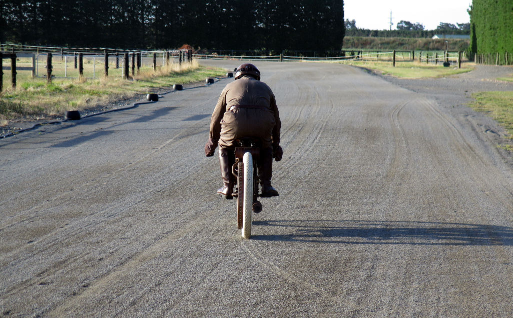As you can see from the photographs of the bike in action, it has been tested on an 800m trotting track. In all fairness, the performance of the ’tracker is modest, but when I rode it, it felt fast enough. The riding position, when crouched, gives you quite the crick in your neck, and despite the large radius of the track’s bends, it was still necessary to back off the throttle to negotiate them safely. It is never going to be a shingle-spitting, sideways sliding, speedway broadsider, but instead it is a tribute to the men and machines who 100 years ago bravely took part in the highly risky art of racing wheel to wheel without brakes.