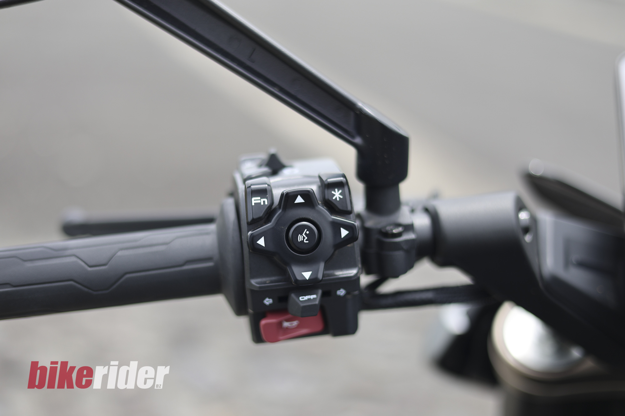 There is switchable mapping with Rain, Street and Sport options available, and while I didn’t bother with rain, I did find Street required a bit too much movement with the twist grip when getting back on a positive throttle, making it a little bit choppy to ride in the twisties. A switch to Sport soon cured that and gave me the instant throttle response I was after as soon as I twisted the grip. Switching between modes is easy using the function button on the left-hand switch block, although it is very crowded on the left-hand side, with cruise control at the top and then a four-way adjustable switch which sits just above the indicator, which then sits just above the horn. It’s busy but probably something you’d get used to if this was your bike. Oh, and the horn is pretty good, by the way.