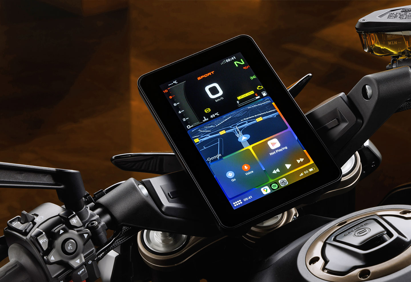What looks like an iPad is an 8-inch TFT screen which offers Apple CarPlay and Android compatibility in full colour. It’s sometimes a little challenging to see in bright sun, but there’s so much functionality it’s almost daunting! Combine with the CFMoto app and you can share digital keys, track the bike and your ride plus loads more!