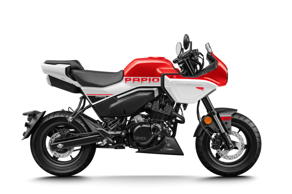 The 2025 CFMoto XO Papio Racer is available in Fiery Red, with other international markets offering additional colours. Its small fairing and racing stripes give it the look of a miniature GP bike — compact, sporty, and eye-catching.