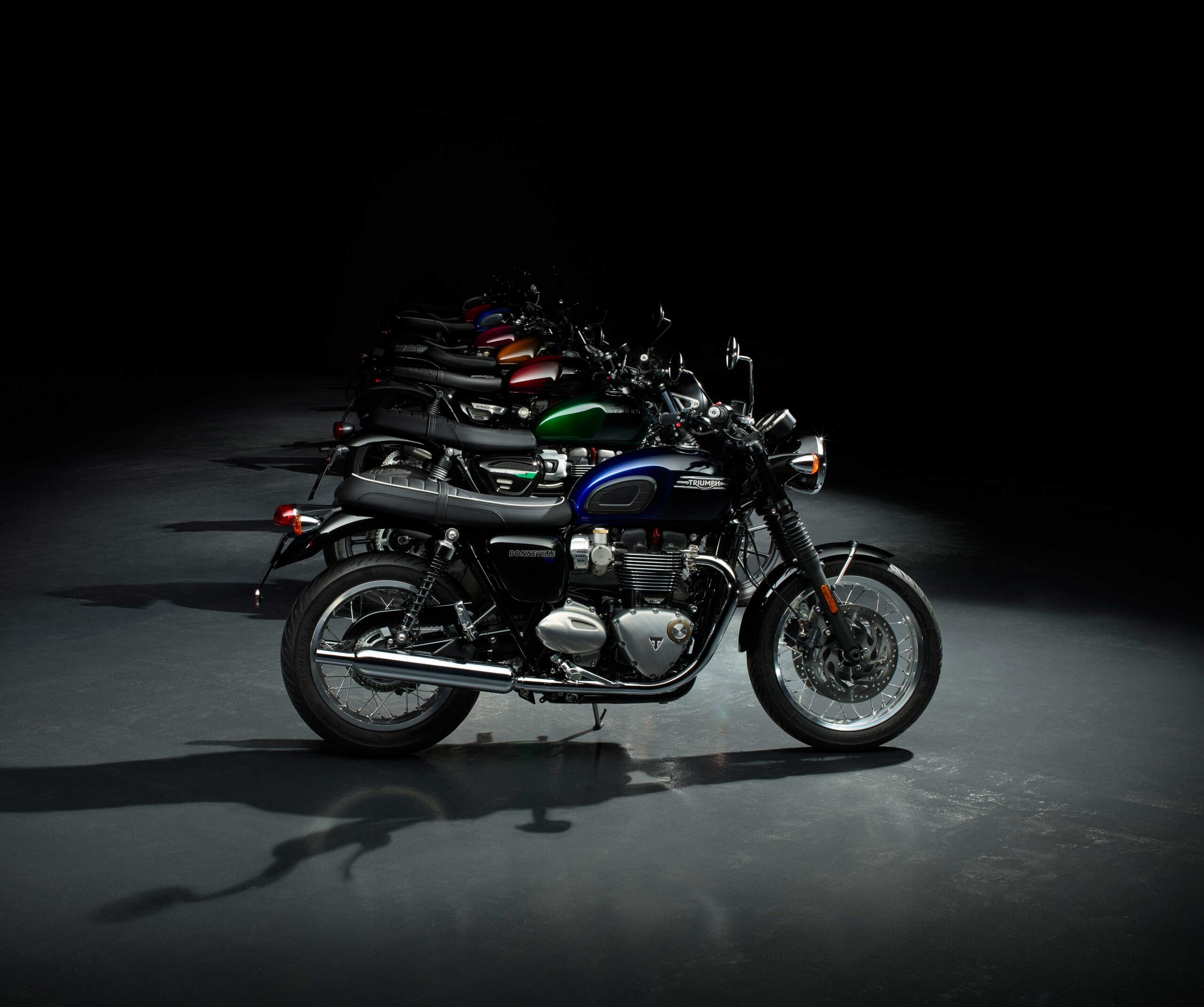 The eight Triumph Stealth Editions include the Bonneville Speedmaster in red, the stripped-back Bobber in purple, the T100 and T120 in a striking blue, the popular Speed Twin 1200 in red and the agile Speed Twin 900 in green, the Scrambler 900 in an eye-catching orange, and finally, the moody T120 Black features a sophisticated matt silver finish.