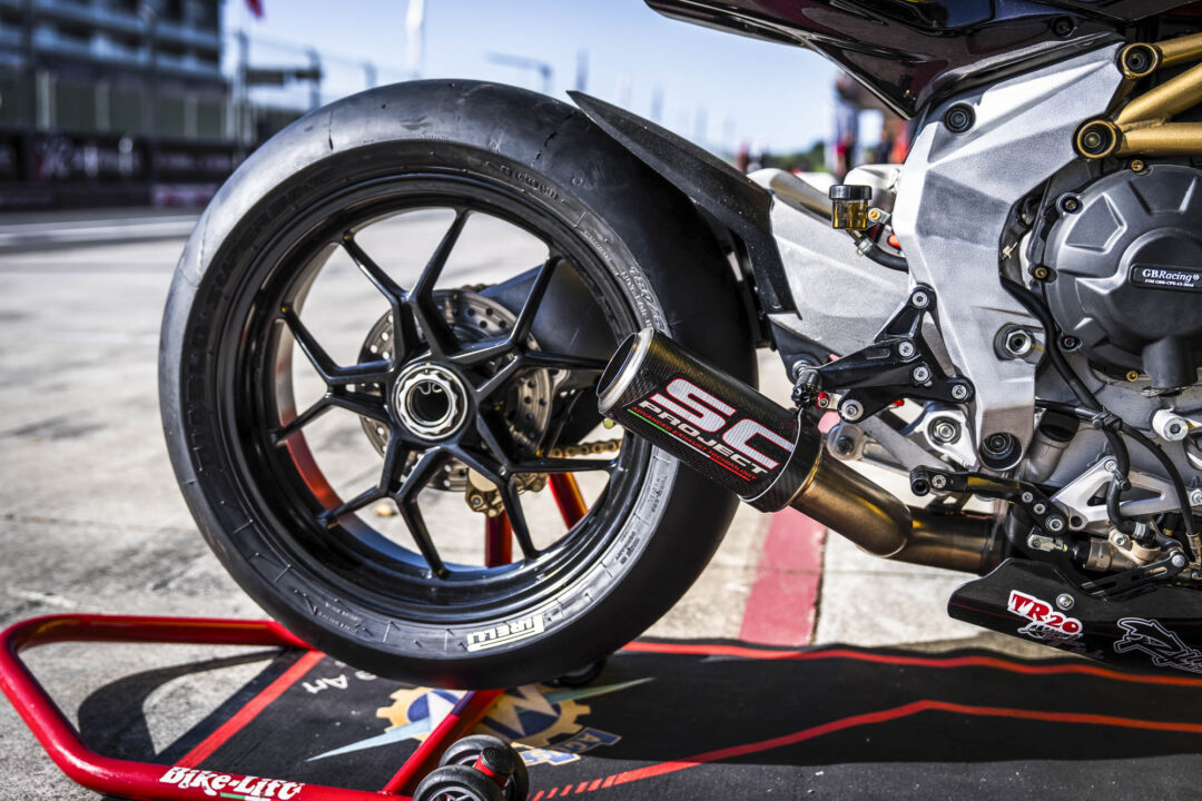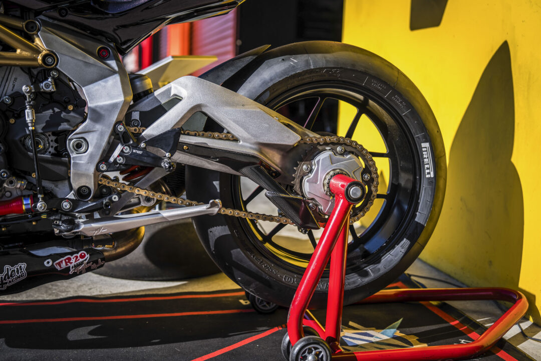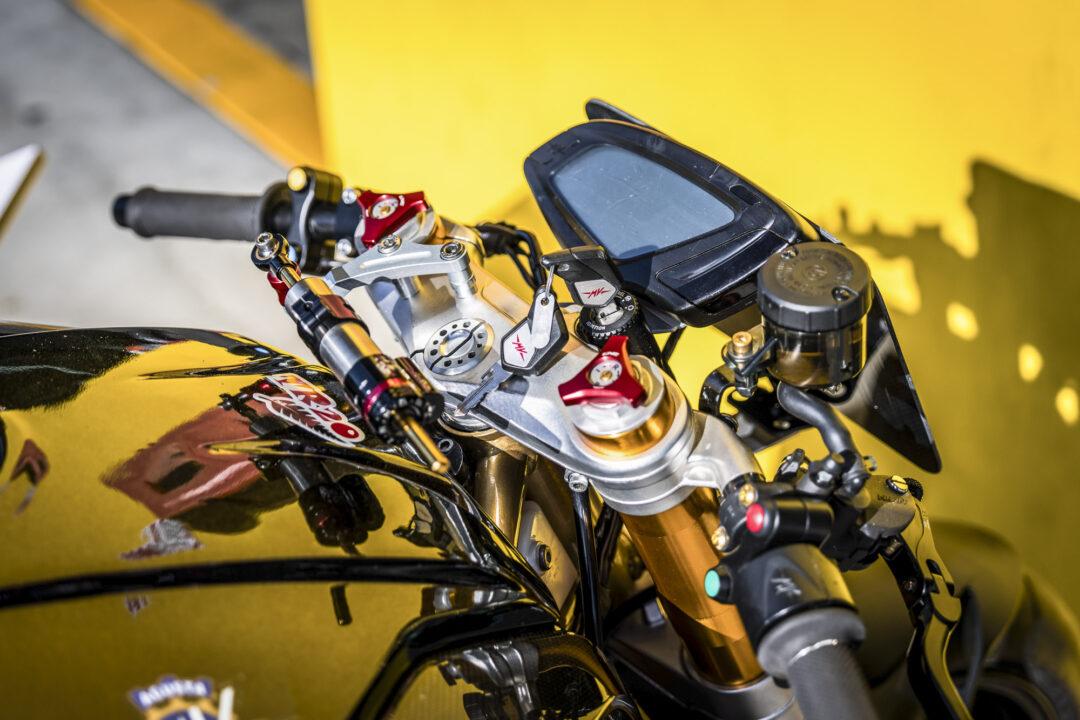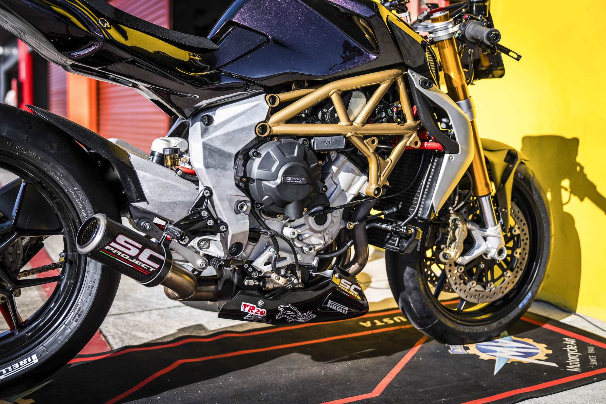 There’s a brand-new 0km engine fitted with an updated black ported cylinder head and a manual cam chain tensioner fitted. Oversized throttle bodies from the MV F3 have been fitted along with an auto-blipper kit for seamless up and down clutchless shifting. There’s a performance MV Corse slipper clutch installed to keep everything under control during quick downshifts, and the SC Project slip-on not only adds to the look but also makes the Brutale sound on point as well.