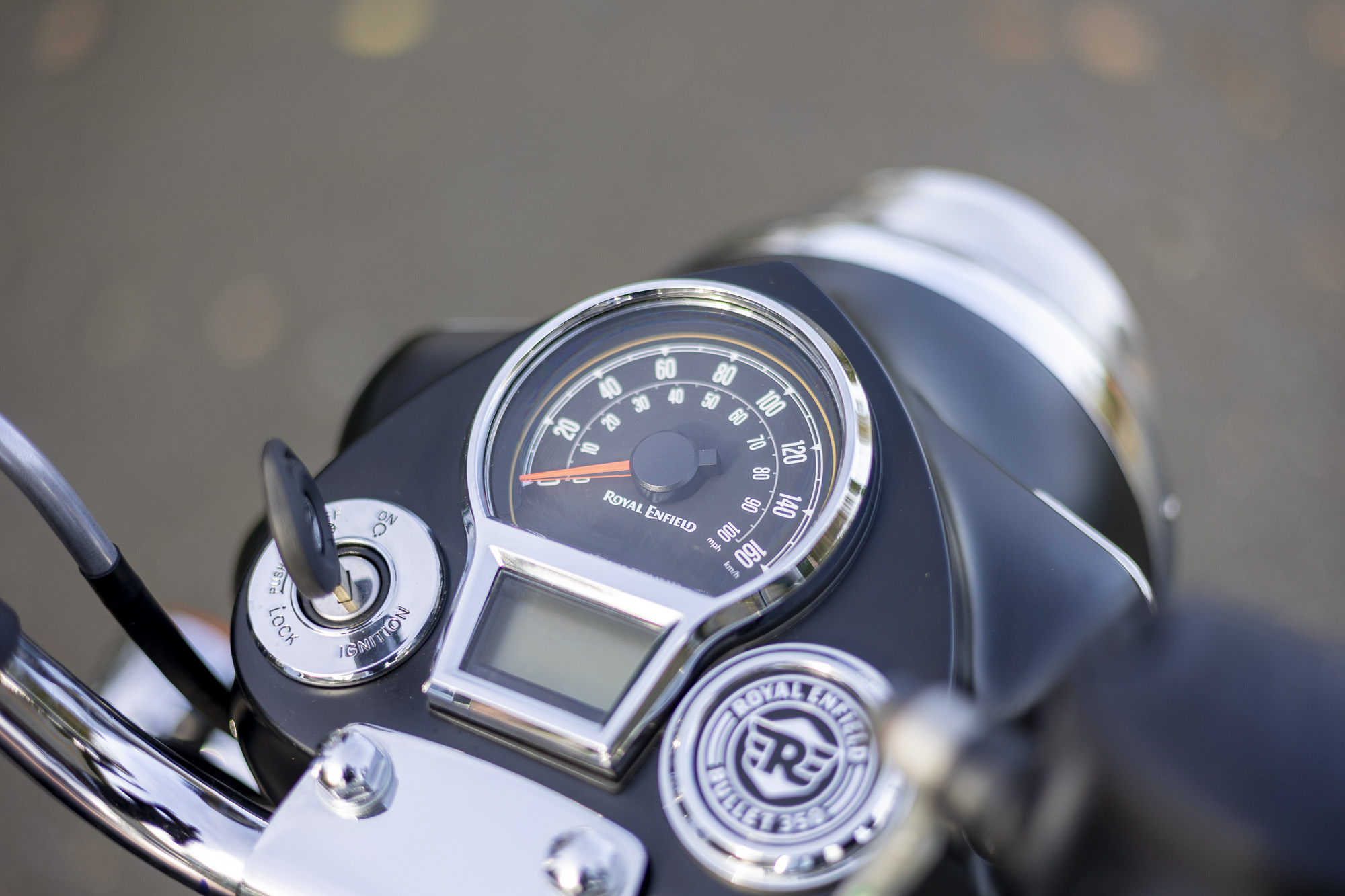 The saddle is wide and sumptuous, and while still shaped with a step up to the pillion’s perch in classic Bullet style, the 805mm it positions the rider from the floor offers plenty of confidence for those keen to be able to get both feet down. The swept-back handlebars gleam in chrome, while the new switchblocks continue with the quality look. There’s even a button to cycle through different options on the LCD screen, although it’s only the trips that change.